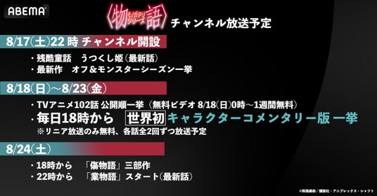 新しい未来のテレビ「ABEMA」は、2024年8月17日(土)22時より、「〈物語〉シリーズ」公式無料チャンネルをOPENすることを決定いたしました。また、キャラクターコメンタリー版を世界初・「ABEMA」独占配信いたします。