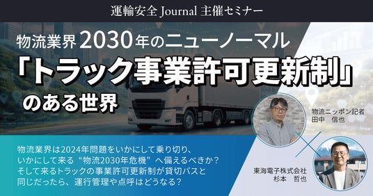 アルコール検知システム、点呼システム、運行管理システム、安全運転管理システムを開発・販売する東海電子株式会社(本社:静岡県富士市 代表取締役:杉本哲也)は、物流ニッポン新聞社と共催で、物流業界の未来を見据えたオンラインセミナー「【物流ニッポン×東海電子】物流業界2030年のニューノーマル ―『トラック事業許可更新制』のある世界―」を、2026年1月30日(金)に無料開催いたします。