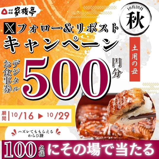 株式会社家族亭(本社・大阪府大阪市、代表取締役社長・坪山 憲司)が運営するそば和食チェーン「家族亭」は、2024年10月16日(水)~10月29日(火)の期間に家族亭公式Xで「家族亭デジタルお食事券 500円分」が抽選で100名様に当たる家族亭公式Xフォロー&リポストキャンペーンを開催いたします。家族亭の公式Xをフォローし、キャンペーンポストをリポストすることで参加ができ、当たりがその場ですぐに分かります。デジタルお食事券の抽選に惜しくも外れた方も、期間中に何度でも使える「わらび餅サービスクーポン」がもらえるとてもお得なキャンペーンです♪ぜひこの機会にキャンペーンにご参加ください。