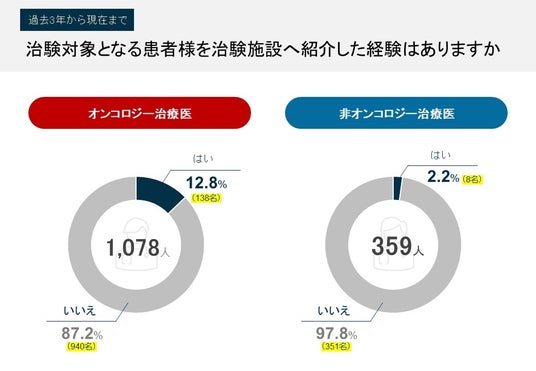 治験実施医療機関への患者紹介の実態:過去3年間で治験対象となる患者様を他科や治験施設へ「紹介した経験がある」と回答した医師は、オンコロジー治療医で12.8%(138名)にとどまり、非オンコロジー治療医では2.2%(8名)とさらに低い結果でした。