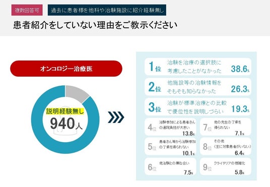 治験実施医療機関への患者紹介に対する課題:患者様を治験を実施している医療機関に紹介していない理由として、オンコロジー治療医の場合、「治験を治療の選択肢に考慮したことがなかった」(38.6%)、「他施設等の治験情報をそもそも知らなかった」(26.3%)が上位を占めました。これらの結果から、他院で実施している治験の情報が医師に十分に届いていない実態が明らかになりました。