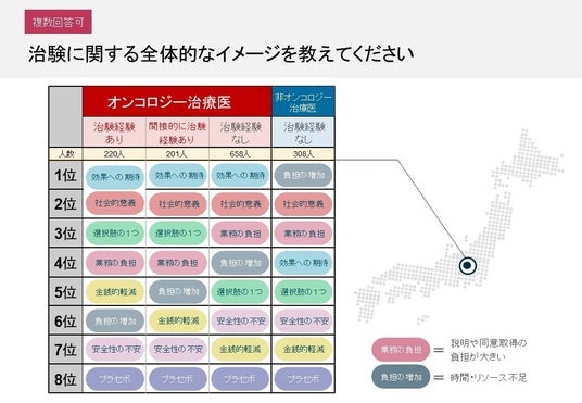 治験関与の有無によるイメージの違い:オンコロジー治療を行う医師のうち、治験責任医師・治験分担医師の経験あり(220人)や、所属の診療科での参加や紹介などで間接的に治験経験あり(201人)の層では、「効果への期待」「社会的意義」「治療選択肢の1つ」といった前向きなイメージが上位を占めました 。一方、治験経験なしの層では、「説明や同意取得業務の負担」や「時間・リソース不足」といったイメージが上位に挙がり、治験が治療の選択肢の1つというイメージも低い傾向にあることが分かりました。