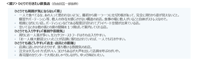 ひとりで行きたい飲食店はどのようなものか、自由回答で聴取した。個室やパーテーションなどで仕切られている、ひとりでも周囲が気にならない「席」のあるお店という意見が多かった。また、ひとりでも入りやすい「客層や雰囲気」、注文はタブレット方式で会話をしないように、逆に、お店の人と会話をしたいなど、ひとりでも過ごしやすい「店主・店員とのほどよい距離」のあるお店がよいとの声もきかれた。<図7>