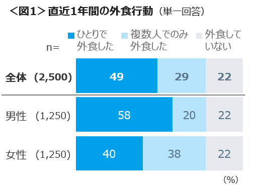 この1年間に提示したジャンルの飲食店で外食をした人は78%、そのうちの49%はひとりでの外食を経験している。ひとりでの外食経験は、男性で58%、女性は40%であり男女差がある。<図1>