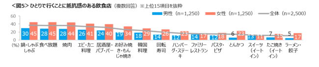 「鍋・しゃぶしゃぶ」「食べ放題」「焼肉」「エビ・カニ料理」「居酒屋・パブ・バー」などが”ひとり外食”する際に抵抗感がある飲食店としてあがった。概ね女性はどのジャンルでも”ひとり外食”に抵抗を感じる傾向にある。<図5>