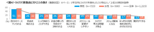 この1年間の”ひとり外食”経験者に良さを聴いたところ、「自分のペースでいられる」が最も多く、次いで「じっくり味わうことができる」「自由を味わえる」であった。女性の方が具体的な良さを実感している人がやや多くみられた。<図4>