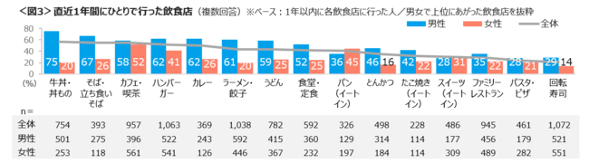 各ジャンルごとの外食経験者に対し、ひとりでの外食率を確認した。男性は「牛丼・丼もの」「そば・立ち食いそば」「カフェ・喫茶」「ハンバーガー」「カレー」「ラーメン・餃子」で6割以上、それ以外の多数ジャンルで”ひとり外食”の経験が高い。一方女性は、「カフェ・喫茶」「パン(イートイン)」「ハンバーガー」「スイーツ(イートイン)」で3割以上。また、男性より女性の方が高いジャンルは「パン(イートイン)」「スイーツ(イートイン)」のみ。<図3>