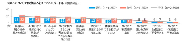 ひとりで飲食店へ行くことへのハードルは、「場違い・居心地の悪さを感じる」「よく知らない場所に行く勇気がない」「話し相手がいなくてつまらない」などがあがった。<図6>