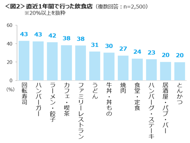 複数人との食事も含む外食ジャンルは、全体で「回転寿司」「ハンバーガー」「ラーメン・餃子」「ファミリーレストラン」「カフェ・喫茶」「うどん」「牛丼・丼もの」が3割を超える。<図2>