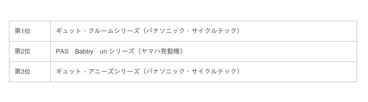 ママ・パパが選ぶ 子乗せ電動アシスト自転車満足度(表1)
