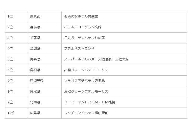 旅行予約サイト「楽天トラベル」 ( http://travel.rakuten.co.jp/ ) は、2015年4月1日(水)~2016年3月31日(木)の期間中に投稿されたお客様評価の高いビジネスホテルランキングを発表し、1位に隠れ家的お宿の東京「お茶の水ホテル昇龍館」、2位に群馬県の「ホテルココ・グラン高崎」、3位に千葉県の「三井ガーデンホテル柏の葉」がランクインしました。