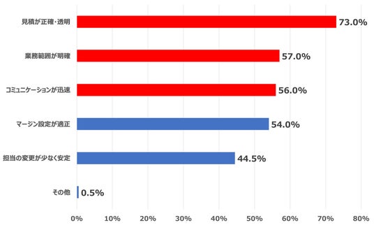 Q6で長い付き合いをしたい発注先の特徴を聞いたところ、 1位「見積が正確・透明(73%)」、2位「業務範囲が明確(57.0%)」、3位「コミュニケーションが迅速(56.0%)」と長期的な関係構築の要素として、見積の透明性が重要であることが明らかになりました。