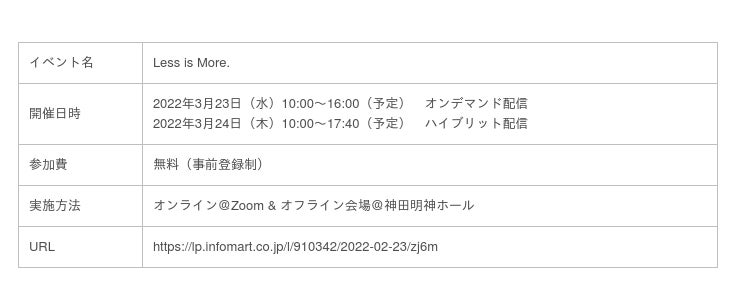<「Less is More.」第9回を3月23日(水)、24日(木)で開催 >