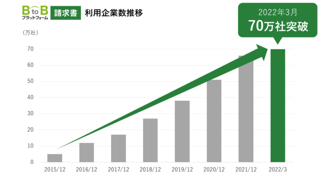 そのような環境の中で「BtoBプラットフォーム 請求書」は、サービスの汎用性の高さから規模の大小を問わず、様々な業界・業態で多くのユーザー様にご活用いただき、2021年11月に請求書クラウドサービス市場において国内シェアNo.1を獲得しておりますが、今回、その利用企業数が700,000社を突破しました。