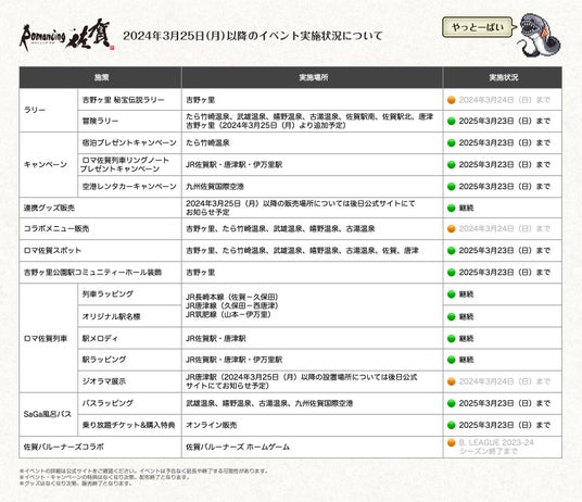 佐賀県は、株式会社スクウェア・エニックスのRPG「サガ」シリーズとのコラボレーション企画「ロマンシング佐賀2023」の佐賀県内での一部のリアルイベントの開催期間を2024年3月24日から、好評につき下記のとおり延長いたします。延長期間は2025年3月23日(日曜日)までを予定しておりますが、予告なく変更や終了する可能性がありますので予めご了承ください。