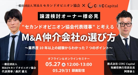 株式会社CINC(本社:東京都港区、代表取締役:石松友典、以下CINC)の子会社である株式会社CINC Capital(所在地:東京都港区、取締役 執行役員社長:阿部泰士、以下CINC Capital)が、経営者向けウェビナー『"セカンドオピニオン協会代表理事"と考える「M&A仲介会社の選び方」~業界歴10年以上の経験からわかった7つのポイント~』を開催いたします。