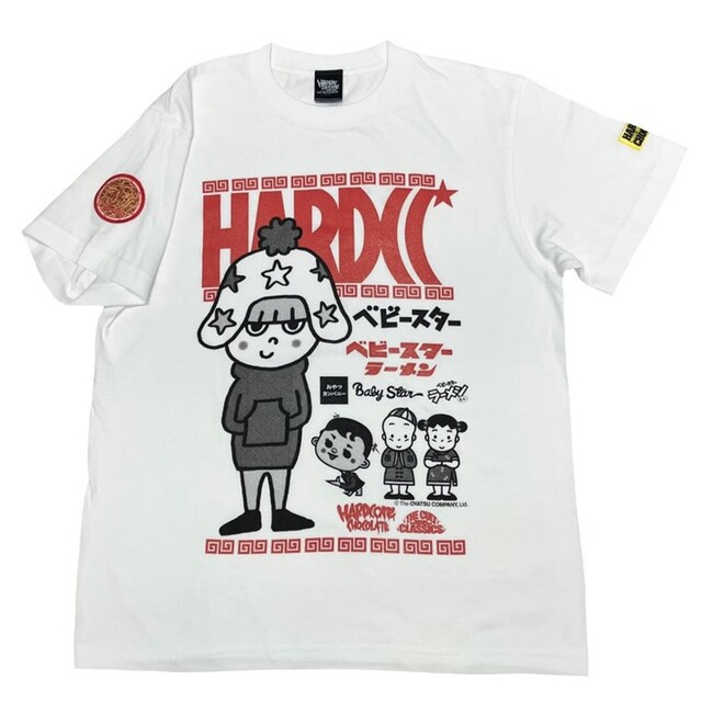 1959年の発売以来、子どもたちの味方・ベビースターラーメン! パリッポリッとした食感とともに、何本食べても飽きのこない美味しいチキン味は全ての子どもたちの定番だ!一本食べても香ばしいチキンの風味が口いっぱいに広がる手頃なスナックとして常にお菓子コーナーの人気者!もんじゃ焼きに入れても最高に美味いのは東京の下町のコなら誰でも知っている!!そのベビースターラーメンがなんとハードコアチョコレートのラインナップに仲間入り!しかも、いつものTシャツに加え特製のベビースターワッペンもついている!HARDCCスターロゴの前でほほ笑むホシオくんにの他にも見覚えのある顔が!初代マスコットキャラクター、2代目のベイちゃんとビーちゃん。袖のワッペンであの美味しさを再現!大人になっても大好きな、とっておきのベビースターの宝物が誕生だ!