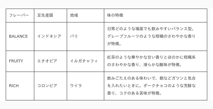 本商品は、世界中から選りすぐりのコーヒー豆を集め、「BALANCE」はインドネシア産、「FRUITY」はエチオピア産、「RICH」はコロンビア産の豆を使用しています。使用する豆は、幾つもの厳しい判定基準をクリアした豆のみに与えられるスペシャルティコーヒー豆を採用。高品質なコーヒーを日常の中で楽しめるよう、手に取りやすい価格で用意しました。