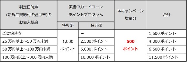 ※本キャンペーンの特典は、カードローンポイントプログラムの特典と重複して受け取ることができます。本キャンペーンで500Pontaポイント、カードローンポイントプログラムで最大11,000Pontaポイント、合計で最大11,500Pontaポイントとなります。