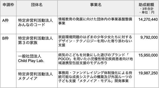「この度は採択頂きありがとうございました。今回の助成をもとに、団体内の基盤を強化し、継続的にインパクトを生み出せる団体へと成長を図ってまいります。そのことが、全国の学校現場で着実にアップデートされた情報教育が実施され、『誰もがテクノロジーを創造的に楽しむ国にする』というビジョンの実現にもつながると信じて活動してまいります」