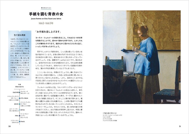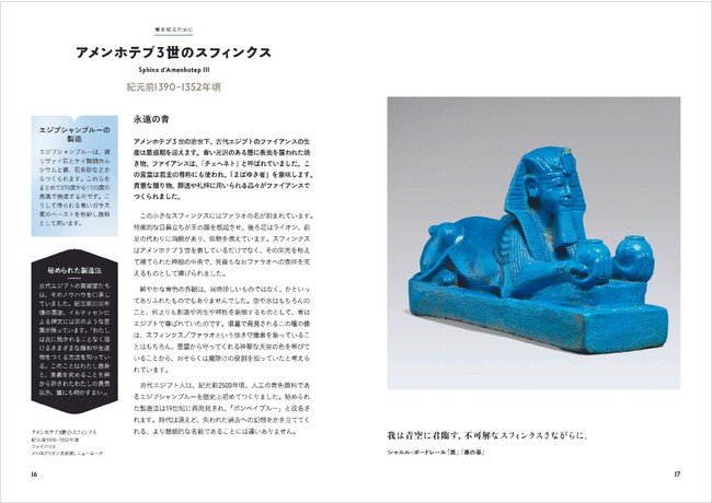 本書は、青を用いた著名な美術作品のビジュアルを多数紹介しながら、青色と美術作品の切っても切れない関係を、気鋭のフランス人美術史研究家が解説します。古代エジプトから始まる、青の成り立ちや歴史なども紹介。主要な青色色素のルーツを世界地図上で俯瞰できるほか、天然色素や合成色素からどのように絵の具として使える色になっていったのかまで、図解でわかりやすく紹介しています。
