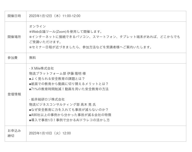 「安全教育を行っても、事故を起こすドライバーが減らない」「管理者の時間がなく、ドライバー教育に手が回せない」など、日々の業務で安全教育や労務管理で課題を感じられる方に向けて開催いたします。ドライバーを危険から守り、社員の定着率UP、そして荷主交渉力を上げるための方法を事例を交えて、お伝えいたします。
