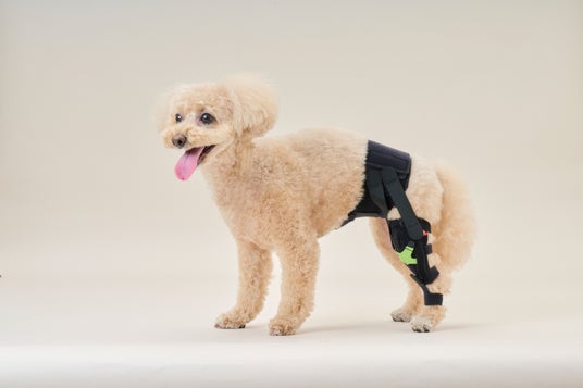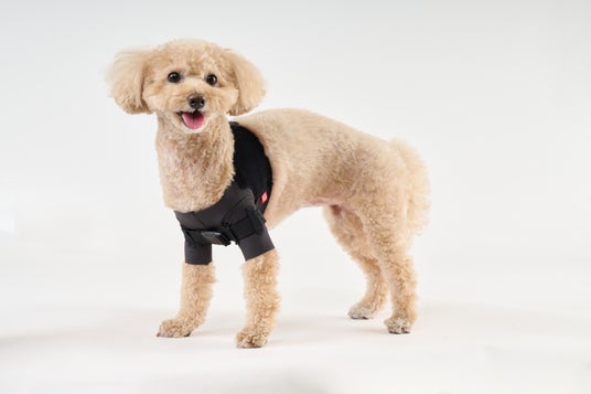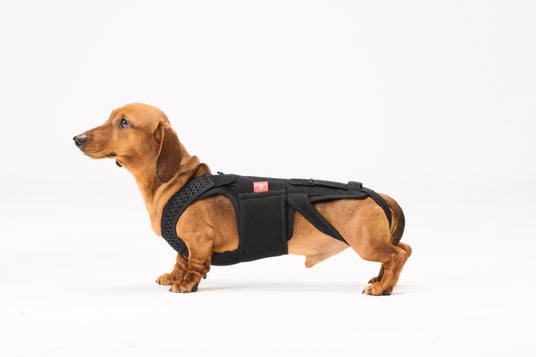 肩関節の外転を抑えるオリジナルサポーターです。ズボンを履くように前脚を通し、背中で面ファスナーを留め、胸元の調整ベルトを締めるだけで装着が完了します。調整ベルトによって肩関節の可動域を調整することもできます。