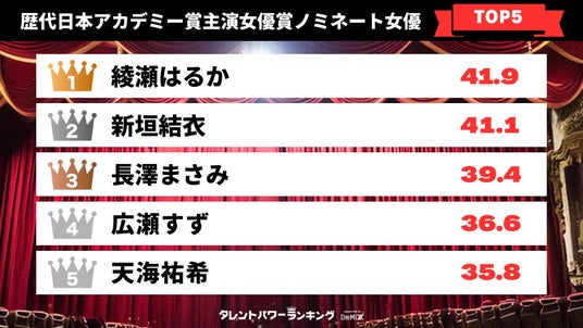 『タレントパワーランキング』では、タレントパワーランキングに登録されている、歴代の日本アカデミー賞主演女優賞ノミネート女優のパワースコアを調査。