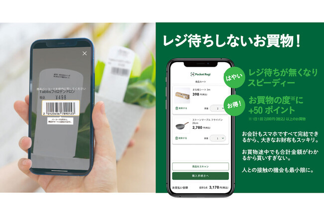 「Pocket Regi(ポケットレジ)」は、カインズアプリを使って商品バーコードをアプリで読み取ることで、アプリに登録されているクレジットカードで決済が完了する便利なサービスです。