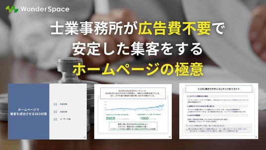 株式会社WonderSpace(本社:東京都港区、代表取締役社長:山本 尚宏)は、『士業事務所が広告費不要で安定した集客をするホームページの極意』に関する資料ダウンロードを開始しました。