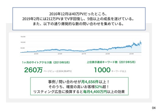 そこで本資料では、広告費ゼロで「40万PVから212万PVへ」急成長し安定的な集客を実現した法律サイトの成功事例をもとに、士業事務所が広告費不要で安定した集客をするホームページの極意を解説いたしました。