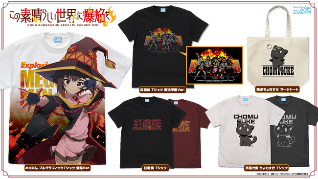 「めぐみん」フルグラフィックTシャツ、「紅魔族」「手描き風 ちょむすけ」Tシャツ、「跳ぶちょむすけ」ラージトートなどが二次元コスパから登場。