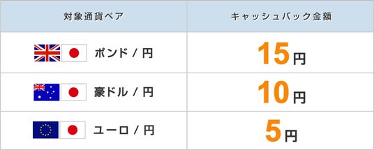 キャンペーン期間中、「ポンド/円」「豪ドル/円」「ユーロ/円」のお取引において、新規または決済取引の約定で、1万通貨あたり下記の金額を上限なしでキャッシュバックいたします!