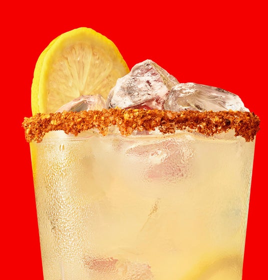 ハイボールグラスの縁にケイジャンシーズニングを付け、氷を入れます。全ての材料を加え、最後にスライスレモンを飾ります。