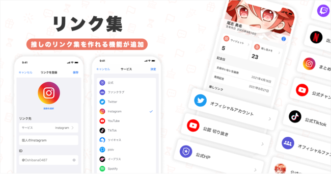 「Oshibana(おしばな)」は、推し活を通して「今日も生きてて幸せ」と思える時間をサポートするアプリです。推しの記念日管理、推し活用ウィジェット作成、推しリンク集、推し活メモといった推し活に特化した機能があります。