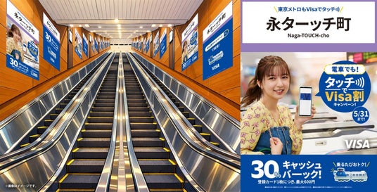 全国展開にあわせ、本キャンペーンでは、キャッシュバックと連動した多角的なマーケティング施策を実施します。首都圏、関西、福岡エリアではTVCMを放映するほか、全国の対象鉄道沿線地域においてデジタル広告や交通広告を展開します。さらに、東京メトロでのタッチ決済乗車サービス開始を記念し、期間限定で丸ノ内線および銀座線の一部車両を車内ラッピングするほか、永田町駅では、駅名と「Visaでタッチ」を掛け合わせ、「永ターッチ町駅」仕様とした構内広告を展開し、電車でのタッチ決済利用の認知拡大を図ります。