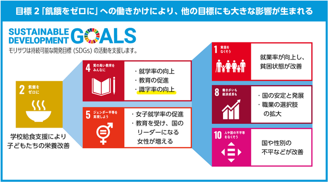 モリサワは「文字を通じて社会に貢献する」を社是としており、学校給食支援を通して子どもたちの栄養改善・教育の促進・世界の識字率の向上など、SDGsの達成に向けた企業活動に積極的に取り組んでいます。