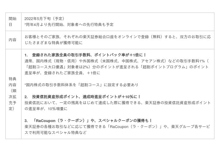 楽天証券株式会社(本社:東京都港区、代表取締役社長:楠 雄治、以下「楽天証券」)は、個人の生活において投資を特別なことではなく「生活の一部に」していくことを目的に、すべての方の資産づくりをサポートするべく、主要ネット証券で初めて※「家族プログラム」の提供を開始することをお知らせします。また、楽天証券をこれまで以上にお得にご利用いただくため、楽天グループが発行するお得なクーポンサービス「RaCoupon(ラ・クーポン)」を活用したサービスの開始も予定しており、あわせてお知らせします。