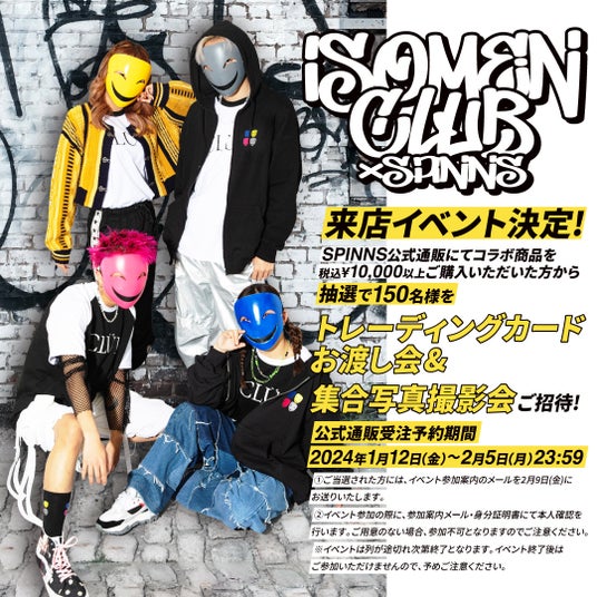 TikToker?YouTuber?Dancer?No,No我々「イソメン倶楽部」でおなじみ、キレのあるダンスとチームワークで人気沸騰中のクリエイター集団「イソメン倶楽部」が、「SPINNS」とのコラボレーションアイテムを2024年1月12日(金)18:00 ~ 2024年2月5日(月)23:59の期間限定で販売を開始しました。