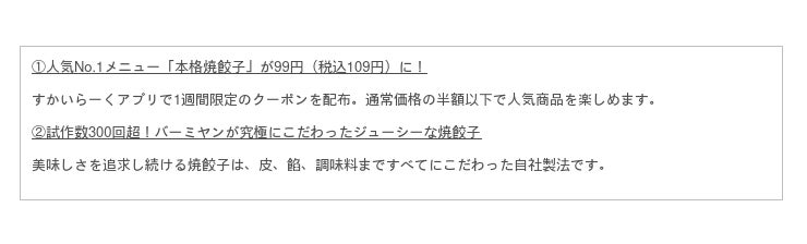 アプリ限定クーポンご利用で「本格焼餃子」が99円(税込109円)