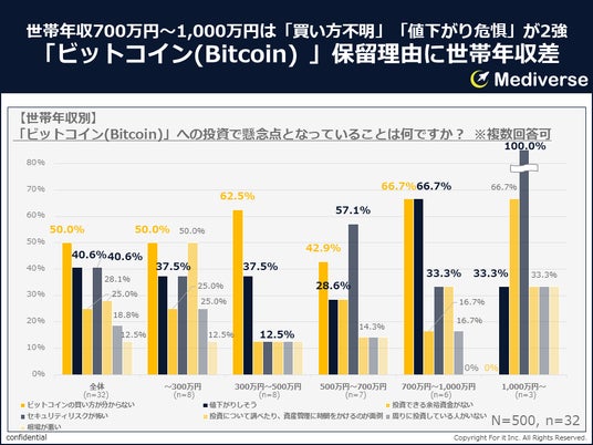 300万円未満の世帯年収層は「ビットコインの買い方がわからない」「投資について調べたり、資産管理に時間をかけるのが面倒」が同率50.0%、300万円~500万円の世帯年収層は「ビットコインの買い方がわからない」62.5%に続き「値下がりしそう」37.5%、500万円~700万円の世帯年収層は「セキュリティリスクが怖い」57.1%に続き「ビットコインの買い方がわからない」42.9%、700万円~1,000万円の世帯年収層は「ビットコインの買い方がわからない」「値下がりしそう」が同率66.7%、1,000万円以上の世帯年収層は「セキュリティリスクが怖い」100.0%に続き「投資できる余裕資金がない」66.7%であることから、暗号資産(仮想通貨)への投資に躊躇するボトルネックは、世帯年収にも影響されていることが推察される。