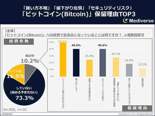 「ビットコイン(Bitcoin)」への投資有無に対して「検討中」と回答した10.2%に向け、懸念点となっていることを聞いてみると、TOP3は、「ビットコインの買い方がわからない」「値下がりしそう」「セキュリティリスクが怖い」がランクインしていた。