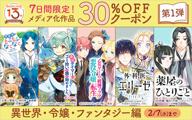 『外科医エリーゼ』『乙女ゲームの破滅フラグしかない悪役令嬢に転生してしまった…』など、アニメ化作品をはじめ人気の作品に使用できる30%OFFクーポンを、期間中週替わりで配布します。クーポンは各対象期間中、何回でも利用可能です。