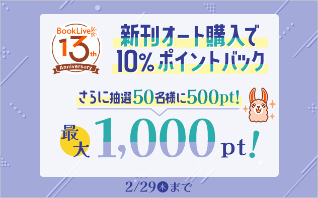 キャンペーン期間中に「新刊オート購入」機能に登録し、購入すると、購入金額の10%のブックライブポイントをポイントバック!(上限500pt)