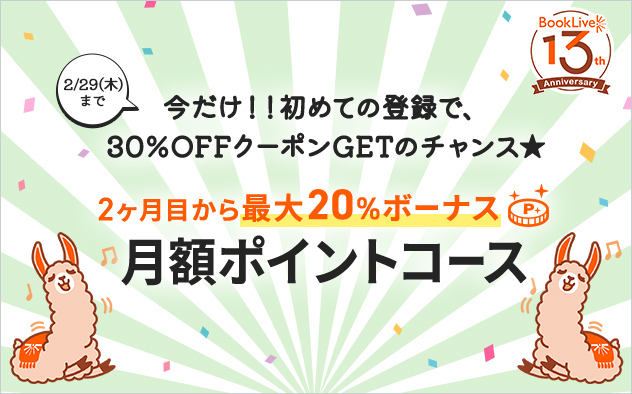 期間中に、毎月定額でブックライブポイントをお得に購入出来る「月額ポイントコース」に初めて登録してくださった方の中から、抽選で130名様に3冊まで使用できる30%OFFクーポンをプレゼントします。