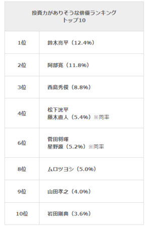 最後に、投資力がありそうな俳優について回答してもらいました。1位は鈴木亮平さん(12.4%)、2位は阿部寛さん(11.8%)、3位は西島秀俊さん(8.8%)という結果になりました。