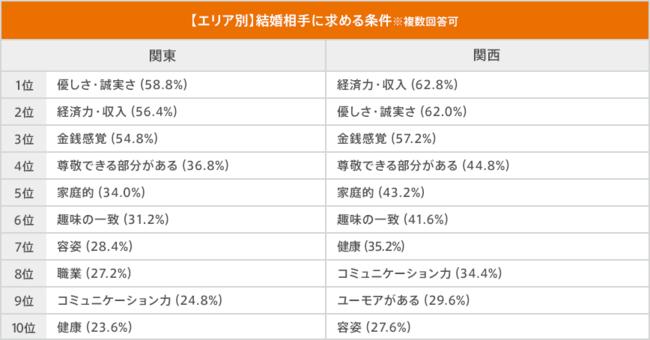 関東では「優しさ・誠実さ」、関西では「経済力・収入」を一番求める傾向に