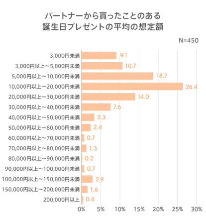 ・パートナーから貰った誕生日プレゼントの平均想定額は4人に1人が「10,000円以上~20,000円未満」