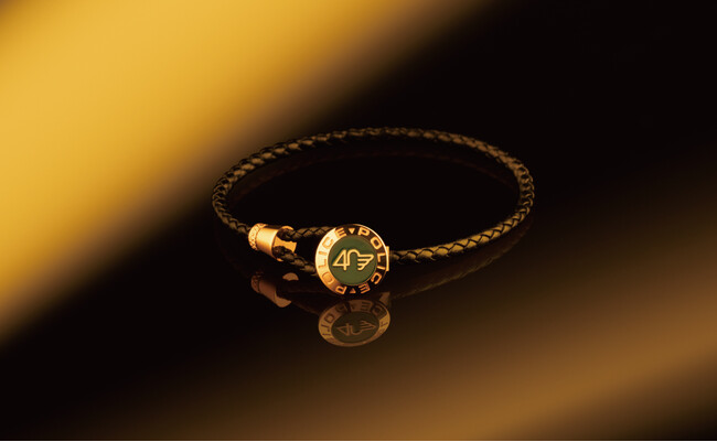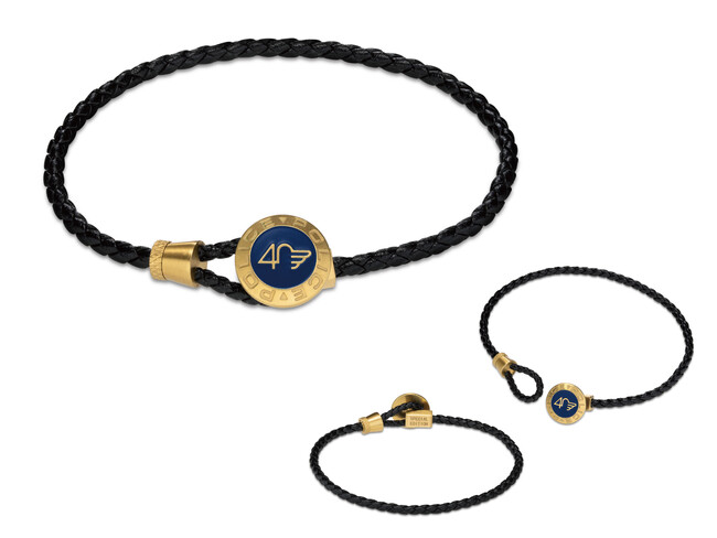 繊細に編み上げたレザーコードのブレスレットは、40thのロゴをエンブレムのようにあしらった留金をループで留める仕様。カジュアルなデザインにエレガントな要素を加えることで、ブランドの歴史を感じさせます。
