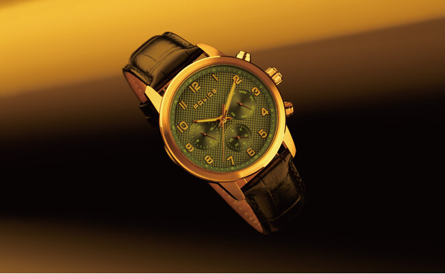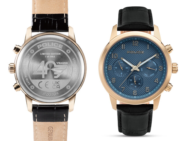 グレーのサンレイ効果とブルーのトップガラスのフェイスがスタイリッシュな40th限定ウォッチは、3時位置に曜日・6時位置に日付・9時位置に24時間表記を備えたマルチファンクション。艶消しとポリッシュ仕上げのゴールドIPメッキとブラックレザーのストラップは、クールかつラグジュアリーな印象で、裏蓋にはPOLICE40thのロゴが刻印されています。